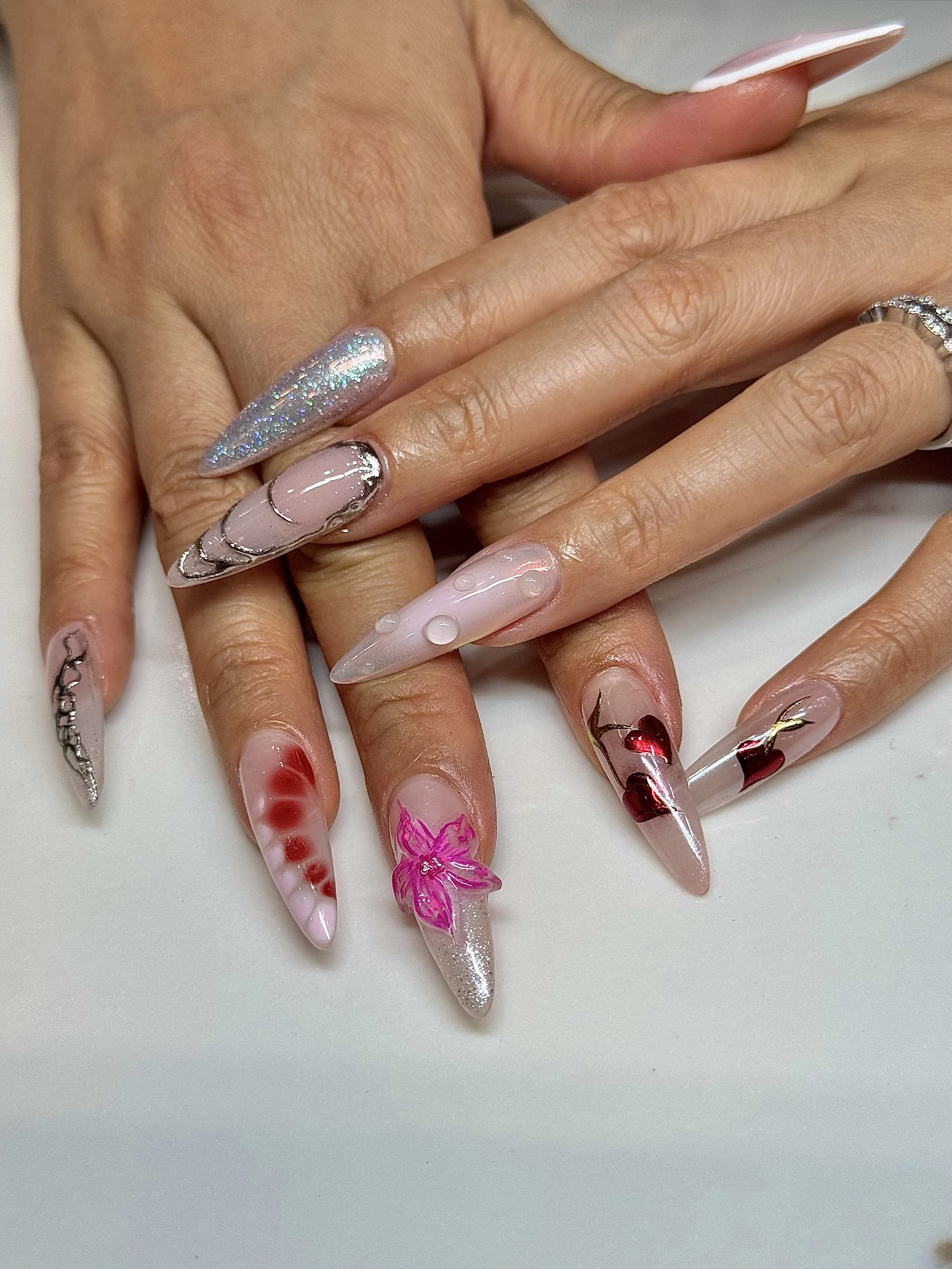 Shaping and Finishing: Once the extensions are in place, your nails are carefully shaped to your desired length and style. We finish with a glossy topcoat for a high-shine, flawless finish.